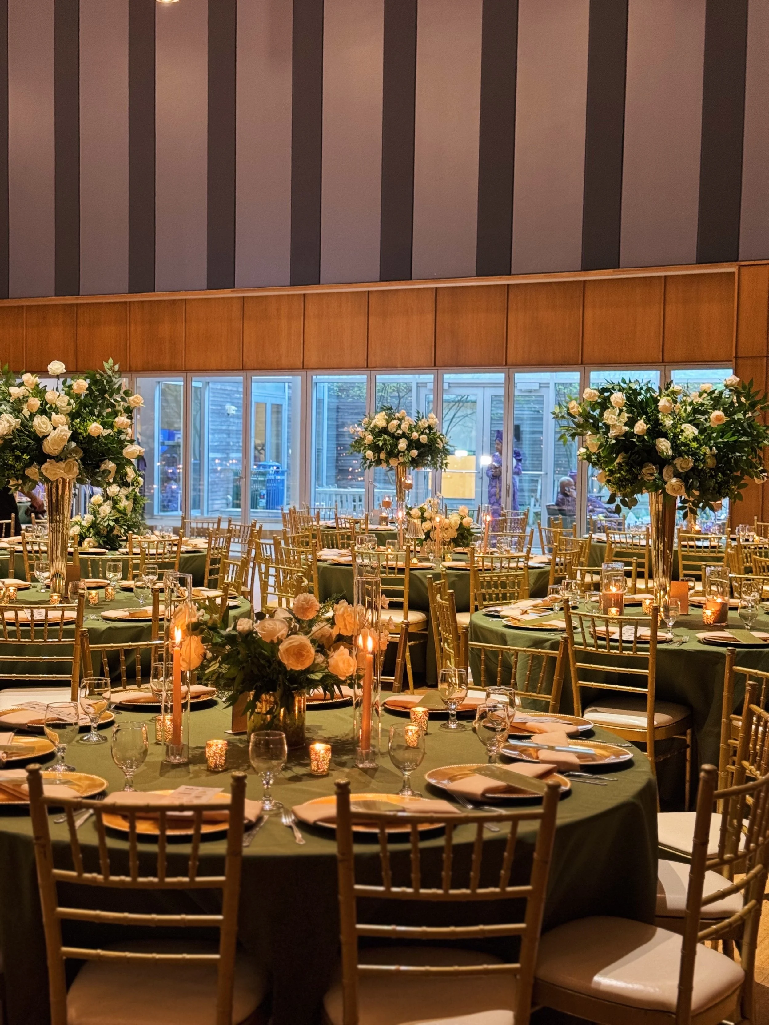 From the walk down the aisle to the last dance, we design wedding décor that feels personal—custom focal points, lush florals (silk or fresh), layered tablescapes, and intentional details at every turn. We orchestrate the décor journey—design, sourcing, staffing, and day-of styling—while you savor the moments.